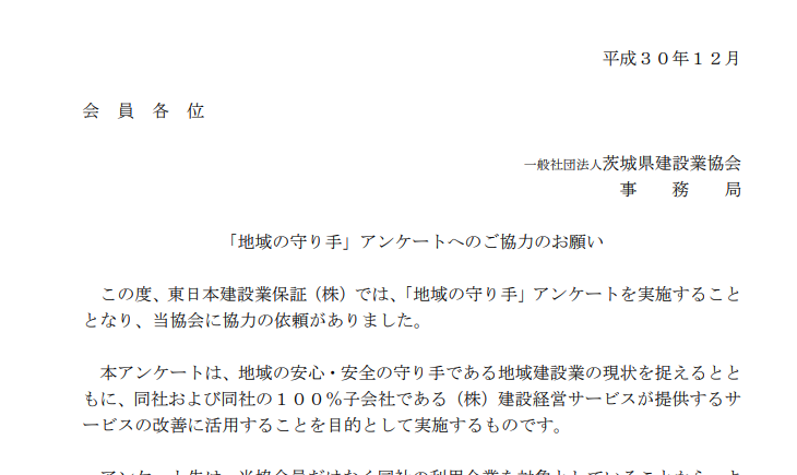 「地域の守り手」アンケートへのご協力のお願い 2018.12.14 「地域の守り手」アンケートへのご協力のお願い 「平成31・32年度茨城県建設工事等入札参加資格(格... 【国交省関東地整利根上】「災害時における河川災害応急...