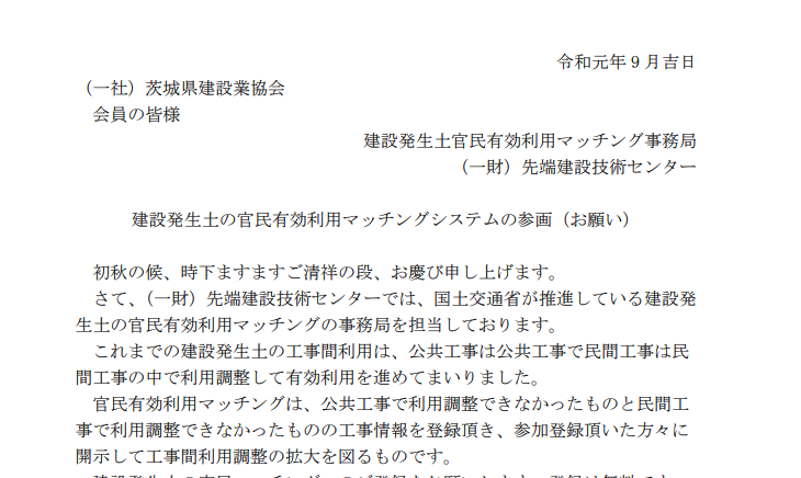建設発生土の官民有効利用マッチングシステムの参画(お願い) 2019.09.01 建設発生土の官民有効利用マッチングシステムの参画(PDF) 建設キャリアアップシステム説明会の開催について【建設... 【建設業振興基金】FARCIフォーラム2019in東...