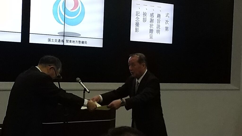 国土交通省関東地方整備局の石原局長より、令和元年台風15号における災害対応業務に対する感謝状をいただきました。