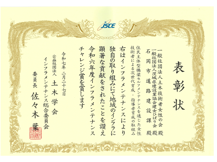 令和7年2月27日(木)、公益社団法人土木学会が運用する「インフラメンテナンス分野の表彰制度」において(一社)土木技術者女性の会、(一社)茨城県建設業協会建女ひばり会、石岡市道路建設課が主体となって実施した、「住民主体型橋梁セルフメンテナンスを通じた女性技術者による次世代育成・指導者育成の取組み」がインフラメンテナンス チャレンジ賞を受賞しました。