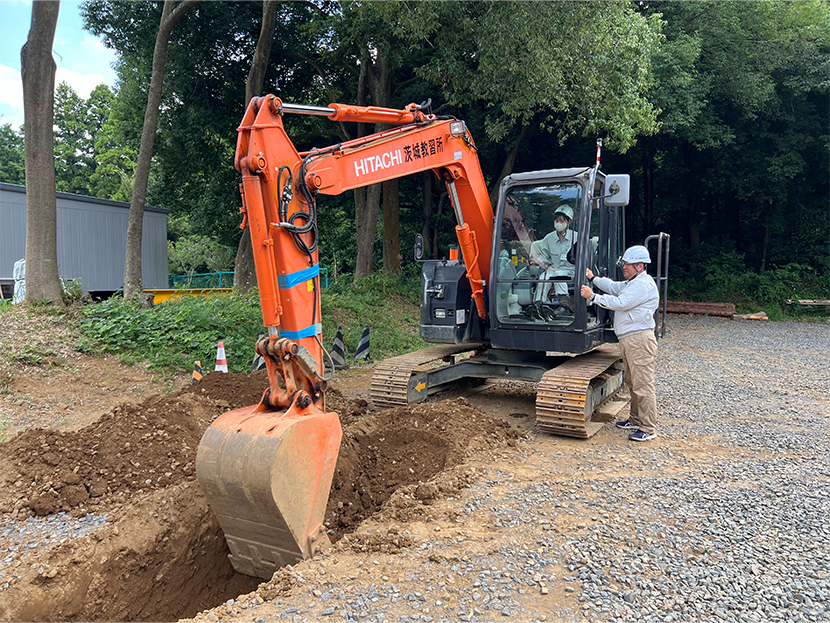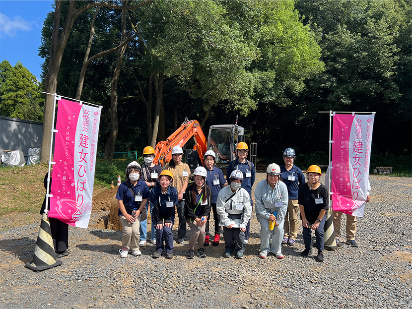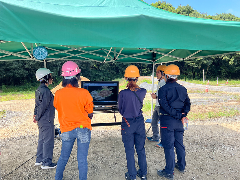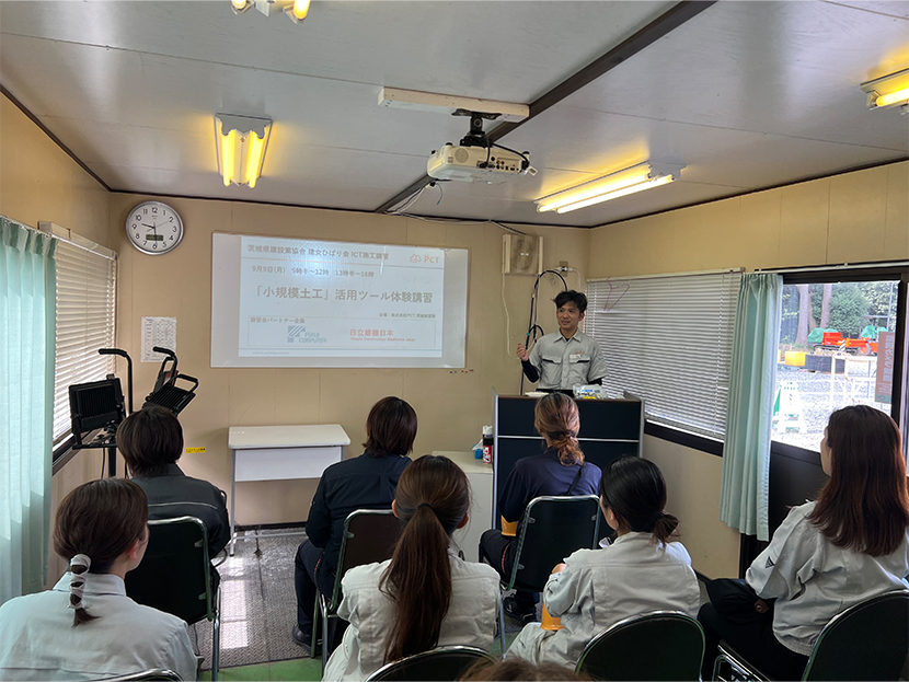 この講習は、株式会社PCT(日立建機特約講習機関)の協力により、「建女ひばり会」向けに体験をメインに企画。小規模土工に対応するICT施工など、普段の業務を効率化できるようなツールを実際に体験しました。