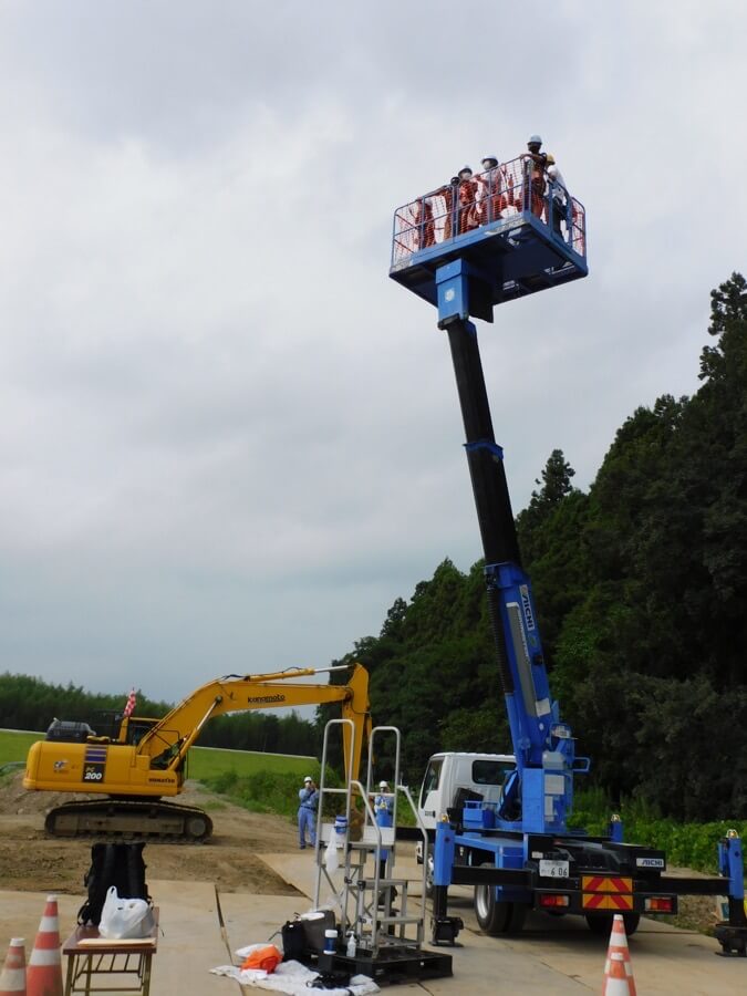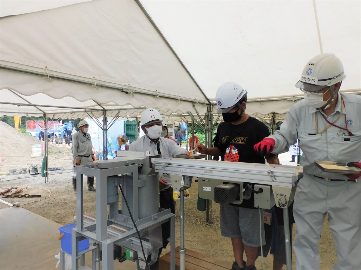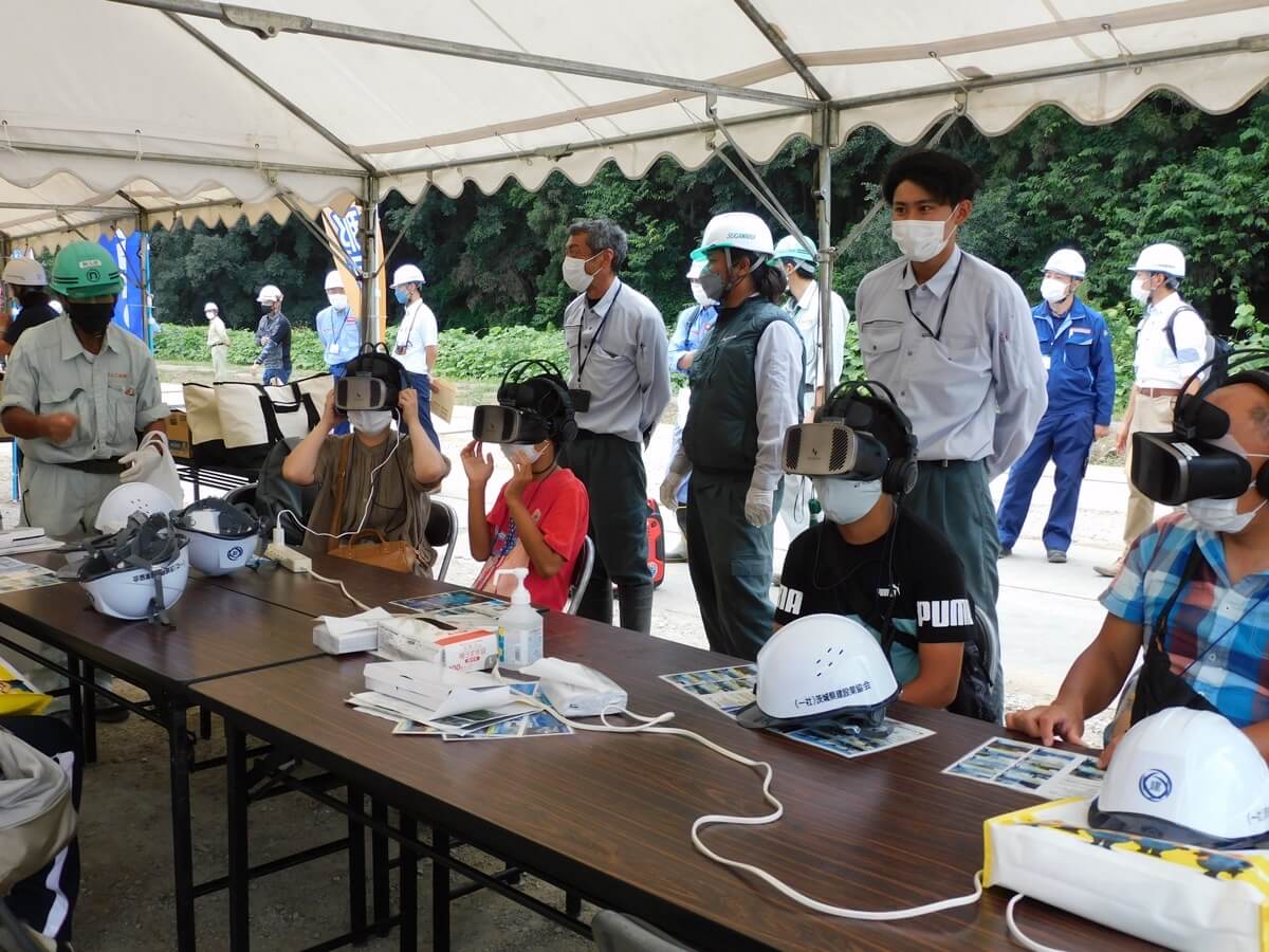 那珂川緊急治水対策プロジェクトや工事概要などの説明後、班に分かれてミニ土砂改良機やVR、遠隔臨場の最先端技術に触れ、高所作業車への乗車体験も実施しました。