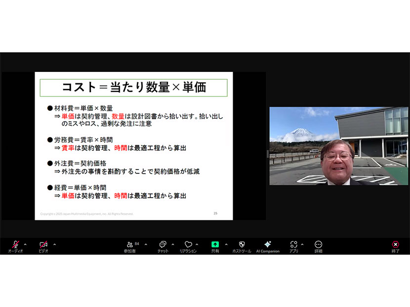 令和7年2月5日(水)、「生産性向上のための建設業バックオフィスDX」オンラインセミナーを開催し、約80名の方に参加いただきました。バックオフィス部門の業務を分析して、法令改正や制度の整備などの影響、ICT技術の現状や未来像など、建設業バックオフィスDXを実現するために必要な知識の理解を目的に、オンライン(Zoomミーティング)により実施。