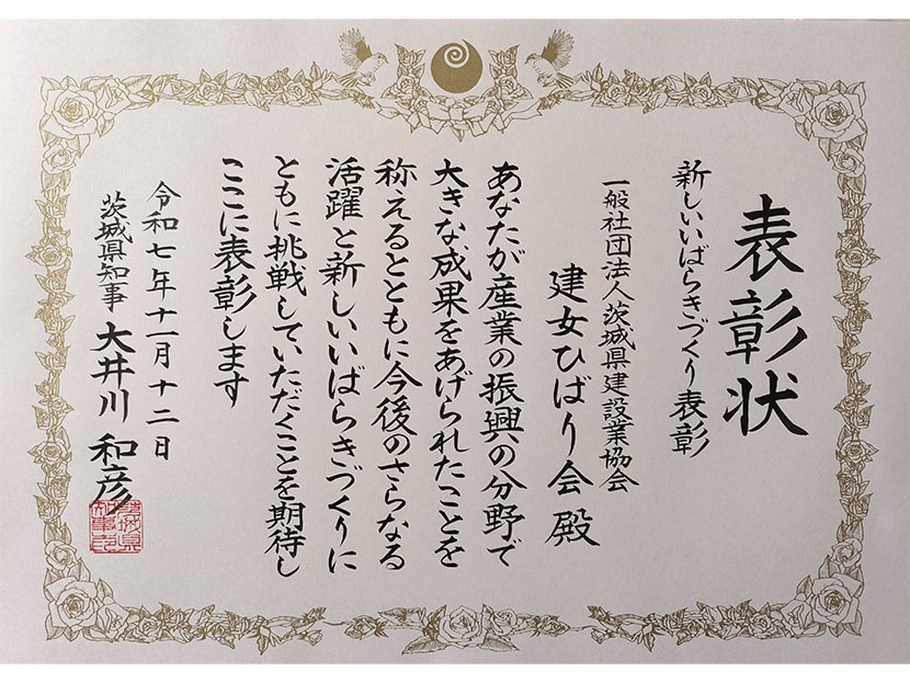 令和7年11月12日(木)、各分野において県勢の発展に著しい功績があった方などをたたえる茨城県表彰にて、「建設業界における女性労働力の確保、建設業の魅力向上の取り組み」が認められたことにより、一般社団法人茨城県建設業協会 建女ひばり会が「新しいいばらきづくり表彰」を受賞しました。